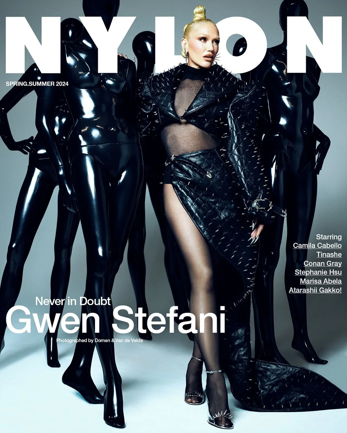 Gwen Stefani on the cover of Nylon magazine, Spring/Summer 2024 issue, wearing a black leather outfit with spiked details, standing amidst black glossy mannequins. conor o'driscoll